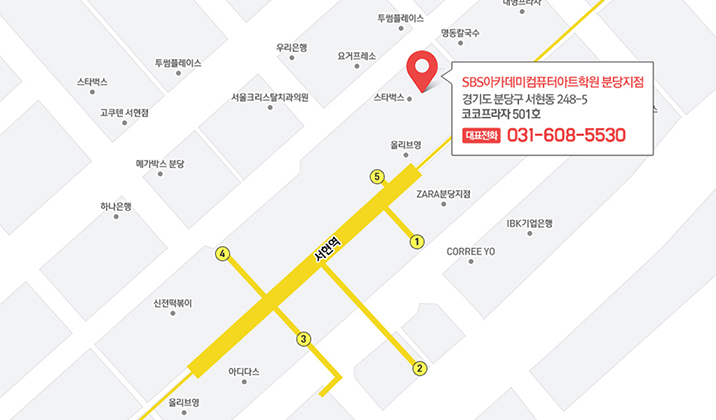 | ㆍ주소 | 경기도 성남시 분당구 서현동 248-5, 501호 SBS아카데미컴퓨터아트학원(서현로210번길 20, 5층) |